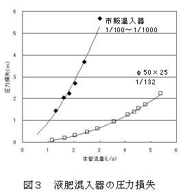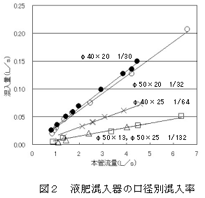 1対の径違いソケットで構成したベンチュリ管とマリオット給水タンクとを透明吸入ビニル管で接続した液肥混入器は、安価で容易に製作でき、適用流量範囲が大きく、圧力損失も小さくて実用的である。 |