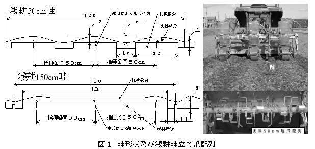 本機は、小畦立て、未耕部への切り込みと浅耕播種を同時に行う作業機である。耕起播種に比べて表面排水性が向上し初期の播種位置付近の土壌が乾き易くなり、播種後の強い降雨でも安定した苗立ちが確保できる。 |
