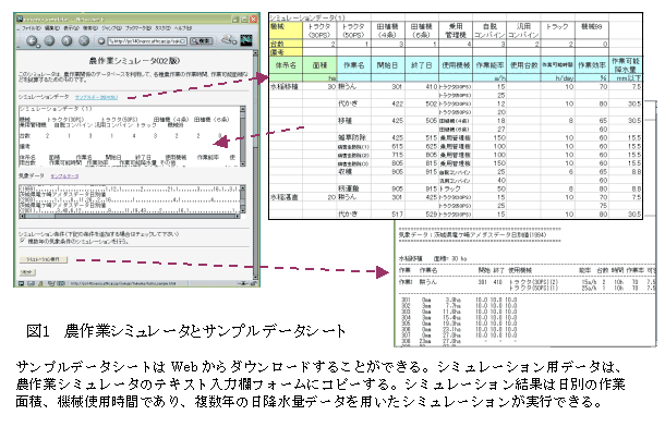 データシートを利用して稲・麦・大豆等の農作業体系のデータ入力が簡便に行える農作業シミュレータ。このシミュレータはインターネットを用いて利用し、水田転換畑における負担面積の推定や新技術を導入した作業改善効果等を予測することができる。