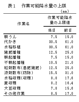 作業可能降水量の上限値は目安の値であり、地域に合った値はこれらの値を参考に検討する必要がある。 |
