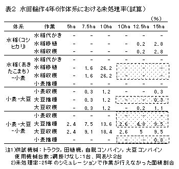 不耕起播種を軸とした稲・麦・大豆4年6作体系のシミュレーションでは、トラクタ、田植機、自脱コンバイン、大豆コンバインを各1台とした機械装備により20haのブロックローテーション(5ha×4ブロック)が、トラクタ等を各2台、大豆コンバインを1台とした装備で40haのブロックローテーション(10ha×4ブロック)が可能(未処理率で5%未満と仮定)であると推定される(表2)。 |