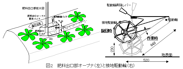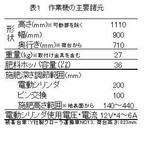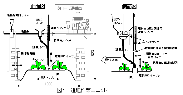 2条植のキャベツの畝中央に追肥を高能率で行うことができる作業ユニットである。肥料出口部オープナを電動シリンダで上下に調整することにより、畝表面直下の位置に施用できるため、葉で覆われた状態でもキャベツの葉を傷つけることがない。作業能率は人力の2~3倍に向上し、約0.8h/10aである。 |