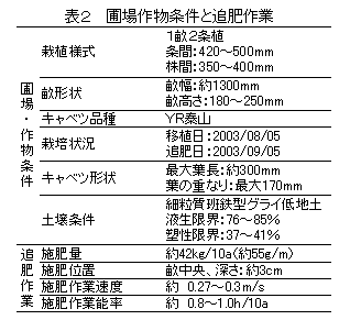 北陸重粘土転換畑におけるキャベツ作では、中耕培土作業は行われないことが多く、追肥位置は、2条植えの場合畝中央である。追肥時期は、畝表面がキャベツに覆われている場合が多く、その時は人力で葉をよけながら追肥作業を行うため、作業能率が低いのが現状である。そこで、2条植えキャベツの畝中央に連続的に追肥を行うことができる作業技術を開発する。 |