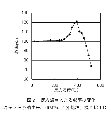 反応温度320℃以上、反応圧力20MPa以上、反応時間3分以上、原料油脂:メタノールの混合比を容積比で1:2~2:1とすることで単相の生成物が得られ、低沸点のアルコールを分離することでBDFとして利用できる。市販キャノーラ油を原料とし、圧力40MPa、反応時間4分、混合比1:1に設定した時、原料油に対する収率は最大120%となる(図2)。 |
