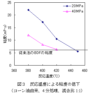 グリセリンの分解と同時に脂肪酸等を分解することにより燃料の粘度を低下させることが可能であり、反応温度を420℃以上とすることで従来のBDFと同等の粘度が得られる。また、反応圧力を増加させることで、必要な反応温度を低下させることができ、変換エネルギーの減少が可能となる(図3)。この時の組成は中鎖脂肪酸メチルエステル、長鎖脂肪酸メチルエステル、ジグリセライド、モノグリセライドおよびその他脂肪族炭化水素からなり、グリセリンおよびトリグリセライドは含有されない。 |