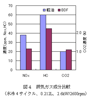 51 606等)を満たす。これを単気筒ディーゼルエンジンに用いた場合、無負荷、最大回転数条件下では軽油と比較してCO2は10%増加するが、NOx,
