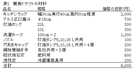 簡易ドラフトの材料はいずれも一般に市販されている。作製も特別な加工を必要とせず容易である(表1、図1、図2)。 |