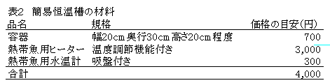 簡易恒温槽の材料は市販の容器、熱帯魚用ヒーター、水温計で、加工は不要である(表2)。昇温にかかる時間は20分程度である。 |