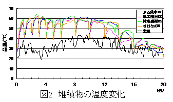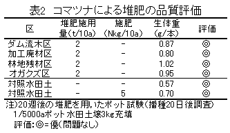 家畜ふんと林地残材、加工廃材およびダム流木の各々の粉砕物を容積比2:1で混合したものは、20週間堆肥化すると、易分解性有機物残存率がオガクズと同様に減少する。その堆肥は、作物の生育に対する阻害性が無い。 |