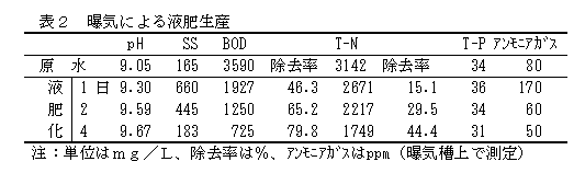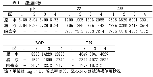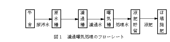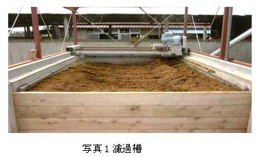 濾過槽(攪拌及び通気装置付き)に、オガクズを濾過資材として充填し、牛舎尿汚水を濾過するとSS、BOD等の汚濁物質が高率に除去できる。さらに濾液を一週間程度曝気処理することで、臭気を抑制した液肥が生産できる。 |