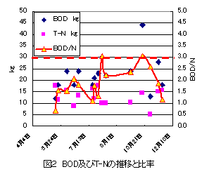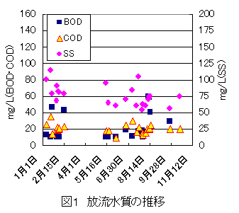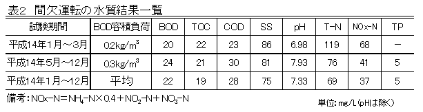 オキシデーションディッチを用いた回分式浄化槽において、1時間運転+1時間停止を繰り返す間欠運転を行っても、BODやCODなどの一般放流水質は年間を通して許容限度を超えることはない。また、アンモニア及びアンモニウム化合物等窒素化合物は、平成16年に導入される規制値の100mg/L以下に維持される。 |