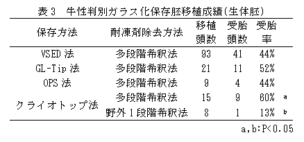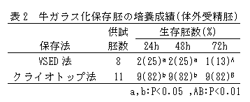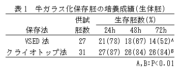 牛胚(特に性判別胚)を長期間保存する場合、クライオトップ法を用いることで高い受胎率が期待できる。 |
