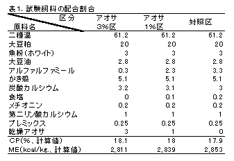 採卵鶏に乾燥アオサを市販飼料および自家配飼料に3~5%配合して給与すると良好な産卵成績が得られ、産卵後期に顕著である。また、アオサ添加群は肝臓中粗脂肪含量が低くなる。人工授精により得た種卵の孵化成績は市販飼料給与群と8%添加飼料給与群とで変わらない。 |