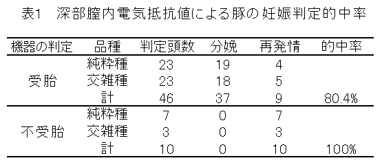 市販の深部膣内電気抵抗値測定器を用いて、豚の妊娠判定の基準(授精後の次回発情予定日1~3日前の計測値が300以上を受胎、300より低値であれば不受胎)を設定し、妊娠診断を行うと、妊娠(受胎)的中率は80.4%、不受胎的中率は100%であった。 |