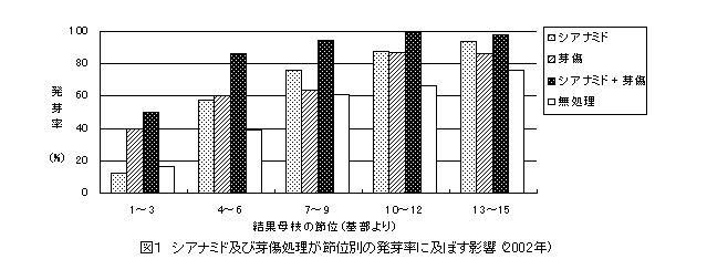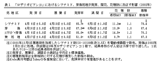 ブドウ「ロザリオビアンコ」において、休眠期にシアナミド剤と芽傷処理を併用することにより、発芽・展葉が早まり、発芽率が向上して花穂数も増加する。 |