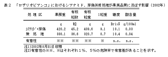 [キーワード]ブドウ、ロザリオビアンコ、シアナミド剤、芽傷処理、発芽率 |