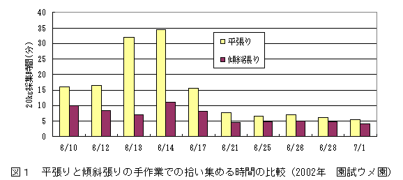高品質の一次加工品(塩漬け梅)ができる完熟落果ウメを、平坦園で効率良く収穫するには、樹間中央部に果実が集まるように傾斜をつけてネットを張り、福井園試等が開発した落果集果機を用いる。この収穫法により集果時間は手作業の約1/5に短縮できる。 |
