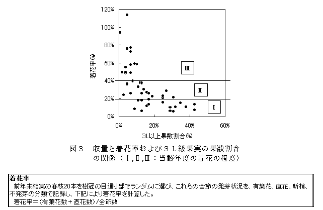 大津4号の3月1半旬の葉中カリウム濃度から、着花量を推定できる。また、葉を採集した前後2ヵ年の収量の変動値と葉中カリウム濃度の関係から、規格外の大果比率を下げる樹体、結実管理方法を判定できる。 |
