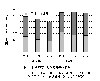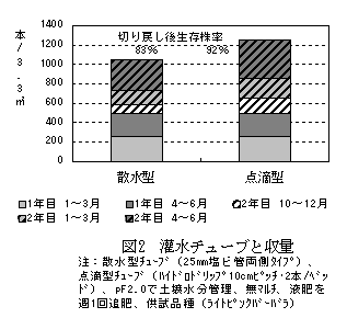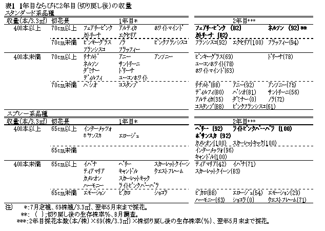 2年切り栽培において、スタンダード系品種では「フェアリーピンク」等、スプレー系品種では「ライトピンクバーバラ」等の計6品種が有望である。また、反射マルチによる定植株数の削減、点滴型チューブ灌水による切り戻し後の株枯れが抑制でき、低コスト安定生産につながる。 |
