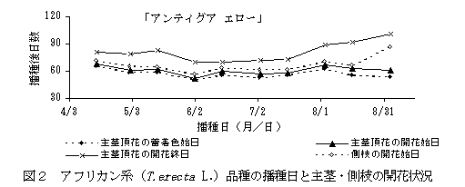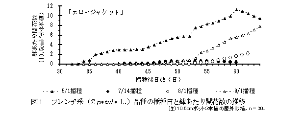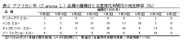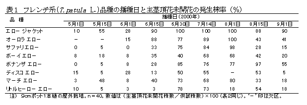 6月中旬から8月中旬に播種するフレンチ系マリーゴールド(Tagetes patura L.)のポット栽培では、主茎頂花が開花せず、開花までの日数が長くなる品種が多いため、品種選択が重要である。アフリカン系(T. erecta L.)品種はフレンチ系に比べて開花は安定している。 |