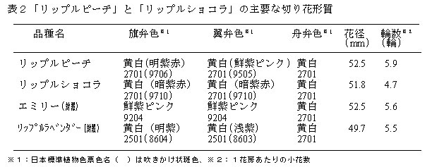 冬咲き性スイートピー新品種「リップルピーチ」は明紫色の、「リップルショコラ」は暗紫赤の吹きかけ模様と縁取りがある。旗弁のウエーブが大きく観賞価値が高い。生育期間を通して草勢が強めで、春先にもボリューム感のある高品質な切り花が得られる。 |