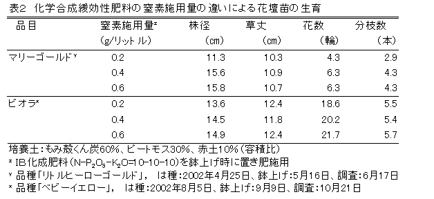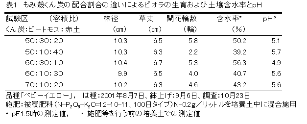 もみ殻くん炭を利用して花壇苗培養土を作る場合、もみ殻くん炭60%、ピートモス30%、赤土10%(いずれも容積比)を混合すれば良い。その場合、鉢上げ時に化学合成緩効性肥料を1リットルあたり窒素0.4g置き肥することによって良質の花壇苗が生産でき、コストも低く抑えることができる。 |