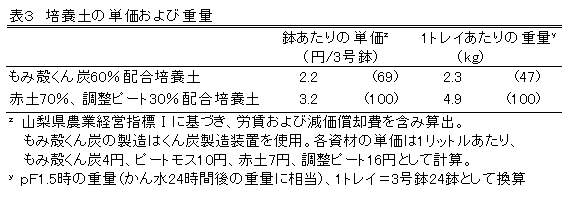 近年、花壇苗需要が増加し、生産も年々増えている。しかし、単価の低い花壇苗を生産するにあたり、その収益性を向上させるためには生産費を抑えることが必要となる。生産費のうち、培養土に占める費用は生産者の工夫によってコスト削減が可能である。 |