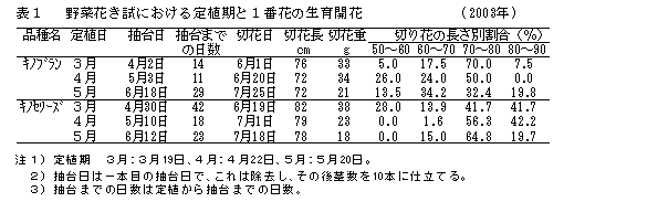 シネンシス系ハイブリッドスターチスは、一般に一季咲き性が強く、開花期は5、6月に集中するため、販売価格の低下や出荷期の労力集中が規模拡大の妨げになっている。既に3、4月出荷が可能となっているが、より作期拡大が望まれる。そこで、夏秋期の生育が比較的良好で、宿根性のキノシリーズについて低温遭遇苗による生育開花反応を検討し、夏秋期出荷技術の確立を図る。 |