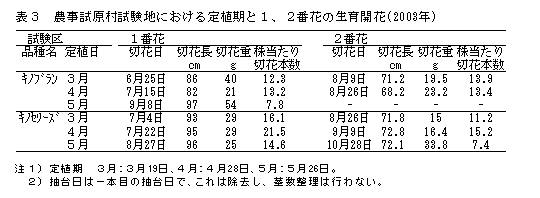 寒冷地から寒地でシネンシス系ハイブリッドスターチス「キノブラン」、「キノセリーズ」の低温遭遇苗を3月~4月下旬に定植し、無加温栽培すれば、1番花を6月~7月、以後2番花を10月までの期間に出荷することができる。 |