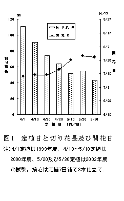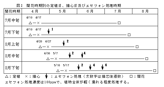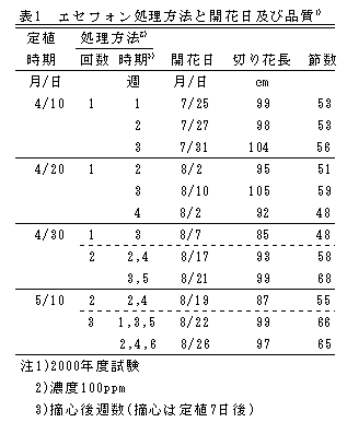 夏秋ギク「スーパーイエロー」の露地栽培における7、8月の開花作型で、切り花長90cmを確保し、計画的に開花させるには、7月中旬開花では4月10日定植の自然開花、以降は5月10日頃まで定植を順次遅らせるとともに、摘心の1週から6週後までの間に、エセフォン100ppmを採花時期に応じて1~3回散布する。 |