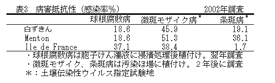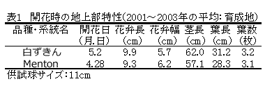 花色が浅黄緑色から黄白色へ変化する極晩生のチューリップ「白ずきん」を育成した。本品種は3倍体で茎葉が大型でかつ、強健である。球根生産性が高く、花壇植えに適する。 |