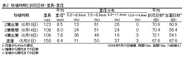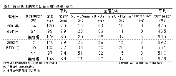 切り花ヒマワリの品質は茎が細いことが重要である。しかし、主要品種「サンリッチオレンジ」では草丈が伸びすぎて茎が太くなり、品質が低下し問題となっている。そこで、短日処理、移植栽培による品質向上技術を確立する。 |