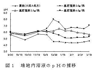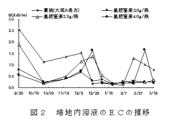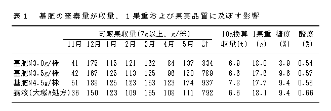 肥効調節型肥料のロングトータル313-180日タイプ及び270日タイプを窒素で株当たり各々2.0g、計4.0g、珪酸加里肥料を加里で1.0g、ようりんを5.0g定植時に培地上へ施肥する全量基肥高設ベンチ栽培は、液肥混入機を必要としないため設備費を低減し、養液栽培と同程度の収量性がある。 |