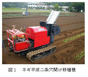 [キーワード]ネギ、平床二条植え栽培、平床二条穴開け移植機、セル成型苗 |