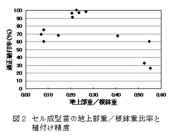 448穴セルに1粒まきで直置き育苗したセル成型苗を用いる新しいネギ平床二条穴開け移植機の利用により、90%以上の適正植付け率を確保できる。また、慣行平床手植えに比べ、移植作業時間が20%程度と大幅に削減され、作業強度も軽減できる。 |