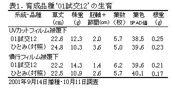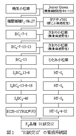 キャベツ由来の萎黄病抵抗性を有するコマツナ‘YR江戸川’(東京農試育成)と市販品種の自殖選抜系統とを交雑し、F1品種‘01試交12’を育成した。本品種は、萎黄病に強く軟弱徒長しにくいため、夏まき栽培(UVカットフィルム被覆下)に適する。 |