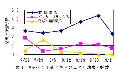 キャベツを有機栽培する場合、定植の3週間前にバンカープランツとして圃場周 囲にデントコーンを、畦間に白クローバをそれぞれ播種すると、虫害が軽減されキャベツの可販収量が大幅に増加する。 |