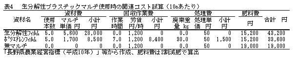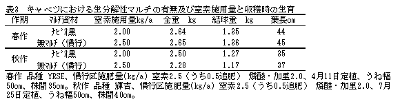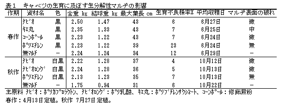 生分解性マルチは、キャベツ、ブロッコリー、カリフラワー等の夏秋どり全面マルチ栽培に利用でき、生育期間の短縮や施肥量の削減、フィルム回収作業の省力化、使用済みプラスチックの排出抑制等に有効である。 |