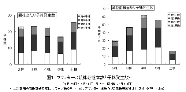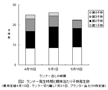 親株をプランターに植付け、ランナー子株を黒ポリポットで受けるポット育苗において、プランター当たりの親株植付け本数は4株とし、5月初旬からランナー出しを行うと、生産性の高い第2、3子株の親株床単位面積当たりの採苗数が最も多くなる。 |