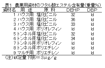 施設またはマルチ栽培では、被覆用のフィルム資材が使われる。これら資材の中には製造過程で可塑剤が混合され、内分泌攪乱化学物質、いわゆる環境ホルモンと疑われるフタル酸エステルを使用しているものがある。 |