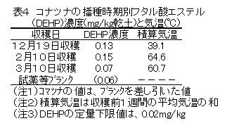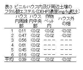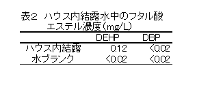 塩化ビニルフィルム中にフタル酸ジエチルへキシル(DEHP)が32~36%含まれていた。ビニルハウス内でフタル酸エステルはビニルフィルムに付着した水分に伴って動くため、結露水に接触させないことが野菜への付着を防ぐうえで重要である。 |