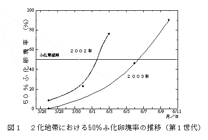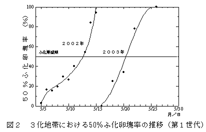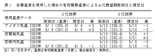 近年明らかになってきている有効積算温度を用いたクワシロカイガラムシ第1世代ふ化最盛期の予測には、近接するアメダス観測地点の温度データを使用すれば2化地帯、3化地帯ともに±3日の精度で推定できる。 |