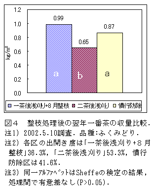 一番茶収穫後に浅刈りを実施し、8月上旬に三番茶芽の上位3葉を整枝すると、越冬前の炭疽病及びチャノミドリヒメヨコバイの発生を抑制することができる。また、二番茶摘採後の8月上旬までに浅刈りを実施することによっても同様の効果がある。 |