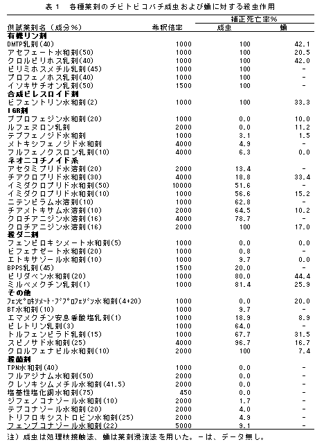 クワシロカイガラムシの天敵寄生蜂であるチビトビコバチ成虫に対する各種農薬の殺虫作用は、有機リン剤、合成ピレスロイド剤では強い。殺菌剤の大部分とIGR剤及びBT剤の影響は弱いが、殺ダニ剤とネオニコチノイド系剤ではその種類により大きく異なる。また、有機リン剤など数種の非選択性殺虫剤は、本寄生蜂の羽化を阻害する。 |