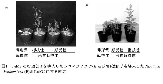 アブラナ科野菜の重要病害であるカブモザイクウイルス(TuMV)の外被タンパク質(CP)遺伝子をシロイヌナズナに組み込んだ後に選抜した抵抗性系統は、極めて広いTuMV分離株に抵抗性を示す。 |