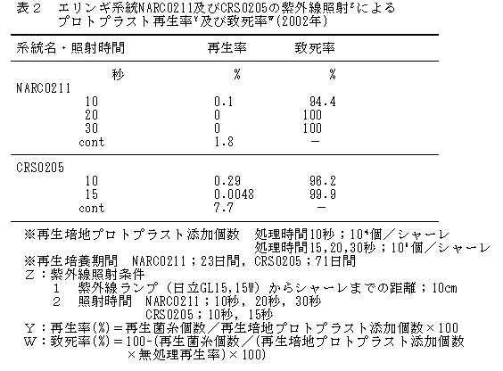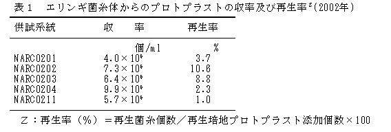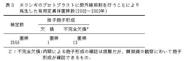 エリンギのプロトプラストに紫外線照射を行うことによって、担子胞子形成欠損変異株の突然変異体が作出できる。 |