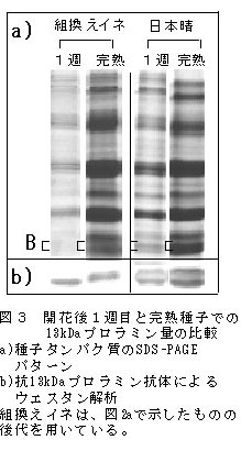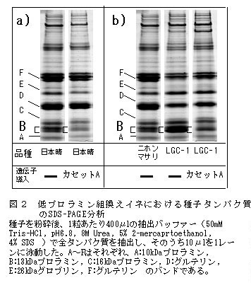 種子のタンパク質の大部分は、貯蔵タンパク質という形で保持されており、イネ種子の場合はグルテリン、グロブリン、プロラミンである。イネ種子(米)の貯蔵タンパク質は、コムギやダイズの場合と異なり加工特性に寄与しておらず、含有量が高くなると米の品質を低下させることが指摘されている。一方、有用タンパク質の遺伝子を導入することにより、種子に外来タンパク質を大量生産させる試み(バイオリアクター)が注目されているが、その場合に種子本来の貯蔵タンパク質を減らして、生じた余剰のアミノ酸を効率良く有用タンパク質の生産に利用する手法が考えられている。 |