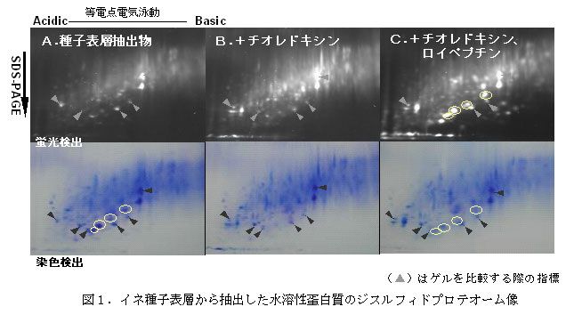 種子蛋白質の機能解明は、種子品質・栽培生理研究や、醸造等における工業的な応用の観点からも重要な研究課題である。アリューロン層を含む種子表層は発芽の際に重要な役割を果たす酵素群が存在すると考えられ、種子蛋白質研究の重要な対象である。一方、酸化還元酵素チオレドキシンによるレドックス制御(SS⇔-SH,HS-の制御)はリン酸化/脱リン酸化に匹敵する重要な制御様式であることが最近明らかになりつつある。本研究では、担当者が開発したジスルフィドプロテオーム(蛋白質ジスルフィド結合の酸化還元状態を包括的に解析する手法)を用いて、レドックス変化の観点から種子表層蛋白質の挙動を解析する。 |