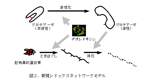 酸化還元酵素チオレドキシンによるレドックス制御は、種子の発芽の際、システインプロテアーゼを活性化させると同時にその基質をときほぐし、分解しやすい状態に構造変化させる。一連のレドックス反応を同時に制御することで、分解反応を効率的に行う。 |