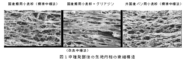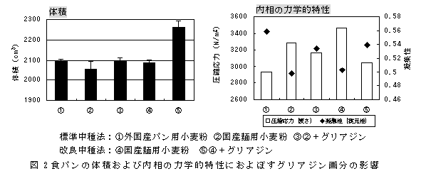 国産麺用小麦粉を原料とした際、小麦蛋白質のグリアジン画分を配合し、改良した中種法を用いることにより、自動製パンラインによる大量生産方式においても、外国産パン用小麦粉を原料としたときと同等品質の製品を製造することができる。 |